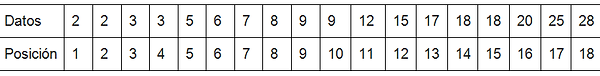 Ej: Para los datos 2, 2, 3, 3, 5, 6, 7, 8, 9, 9, 12, 15, 17, 18, 18, 20, 25, 28 hallar el percentil 60 (utilizando una regla de tres simple)